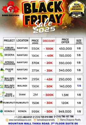 Welcome to Malindi, Kenya’s coastal gem where pristine beaches meet endless investment opportunities. Bama Diaspora Realty Ltd invites you to own a piece of this paradise with our prime Beach...